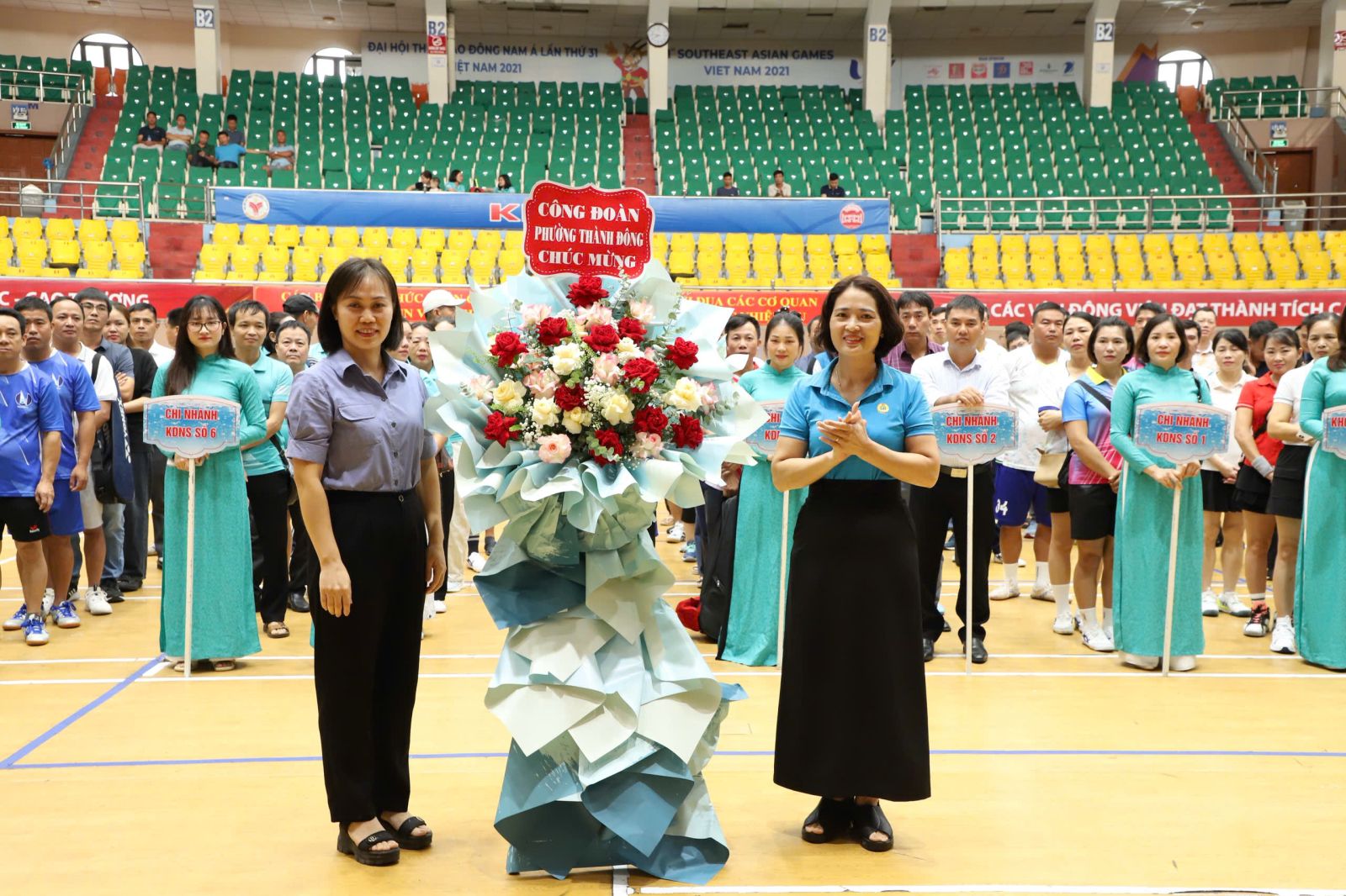 Đồng chí Hồ Thị Hiên - Chủ tịch Công đoàn phường Thành Đông tặng hoa chúc mừng Hội thao